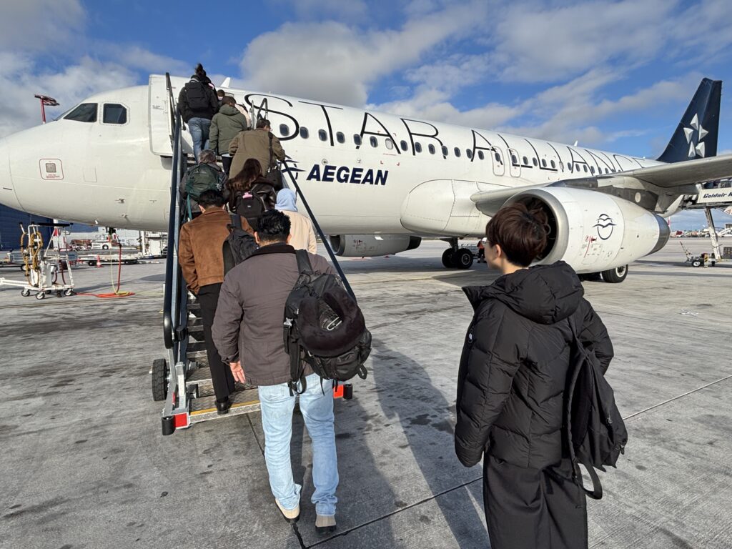 アテネからサントリーニ島へのフライト所要時間は45~55分、飛行機は小型なので、エーゲ航空もスカイエクスプレスもめっちゃ久しぶりに歩いて飛行機に乗りました(アテネは飛行機のそばまでバス)。離陸して安定飛行に入ったと思ったら、すぐに下降を始める感じで、機内では水も出ませんでした。夏の繁忙期は国際線もあるようですが、冬の閑散期だったので、アテネからのフライトが1日数便あるだけ。サントリーニ島の空港には勿論ラウンジはありません。