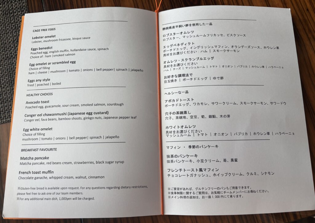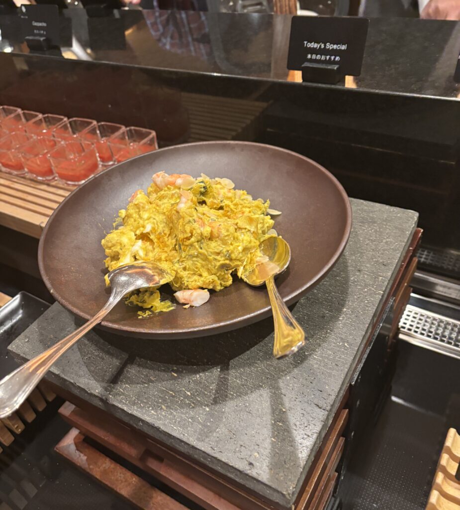 基本ビュッフェですが、一人一品オーダーできます。大人3人だったので、迷いに迷った結果、ロブスターオムレツ、アボカドトースト、抹茶のパンケーキをオーダー。