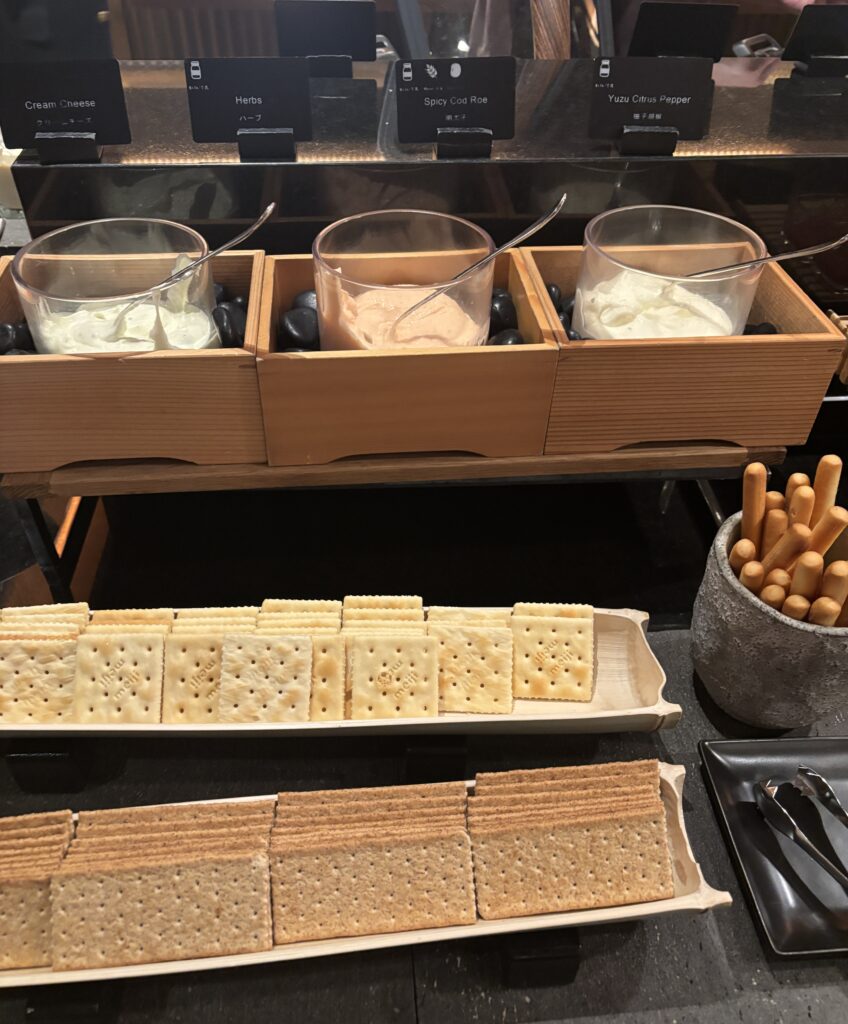 クラッカーとハーブ、明太子、柚子胡椒のクリームチーズ