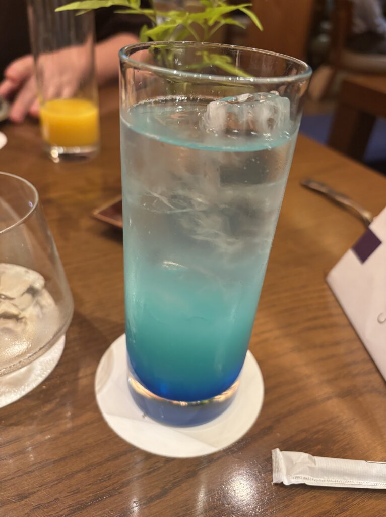 隣りのテーブルの方が頼んでいてとてもキレイな色だったので、私もお願いしてみたノンアルコールカクテル。ノンアルなので、キレイだけど私は梅酒の方が好きでした(頼んでおいてスミマセン・・・)。