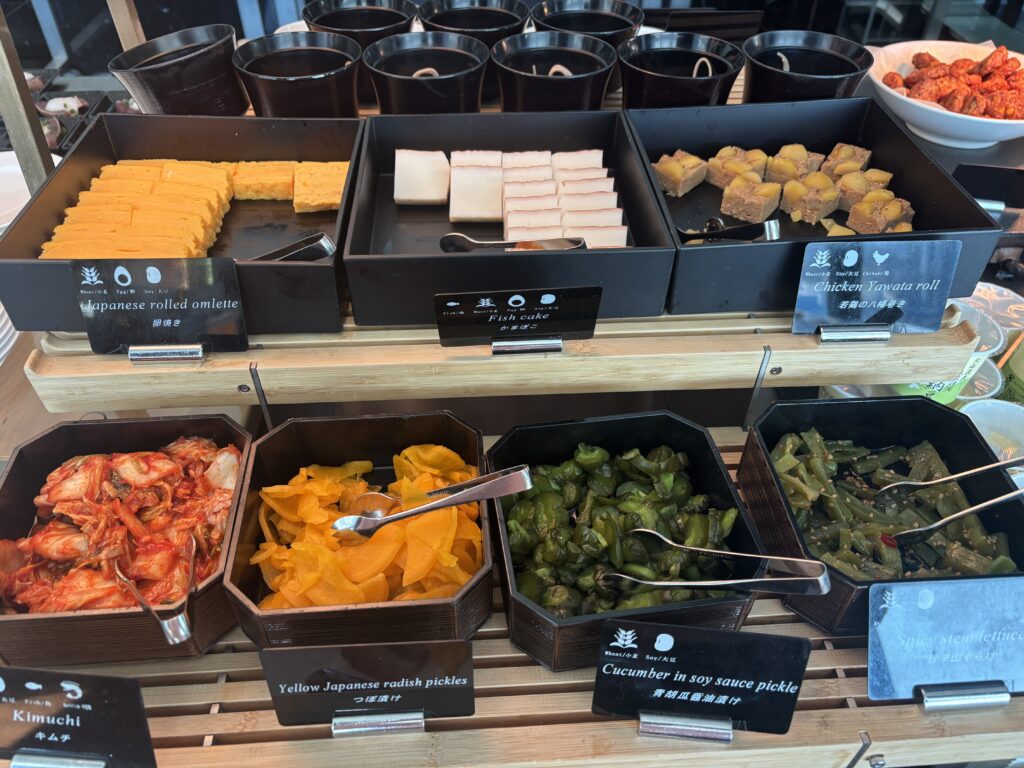 和のコーナーには、卵焼き、かまぼこ、八幡巻き、キムチ、漬物各種、
