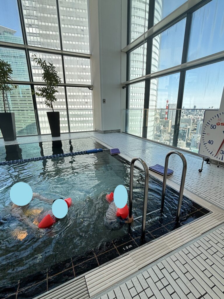 プールは4才以上の子どもが利用可能。コースロープで仕切られていて、奥はガチで泳ぐ方向けでした。一番浅い所でも1m水深があるので、小さい子は腕用浮き輪が借りられます。水泳帽必須ですが、こちらも無料で借りられます。