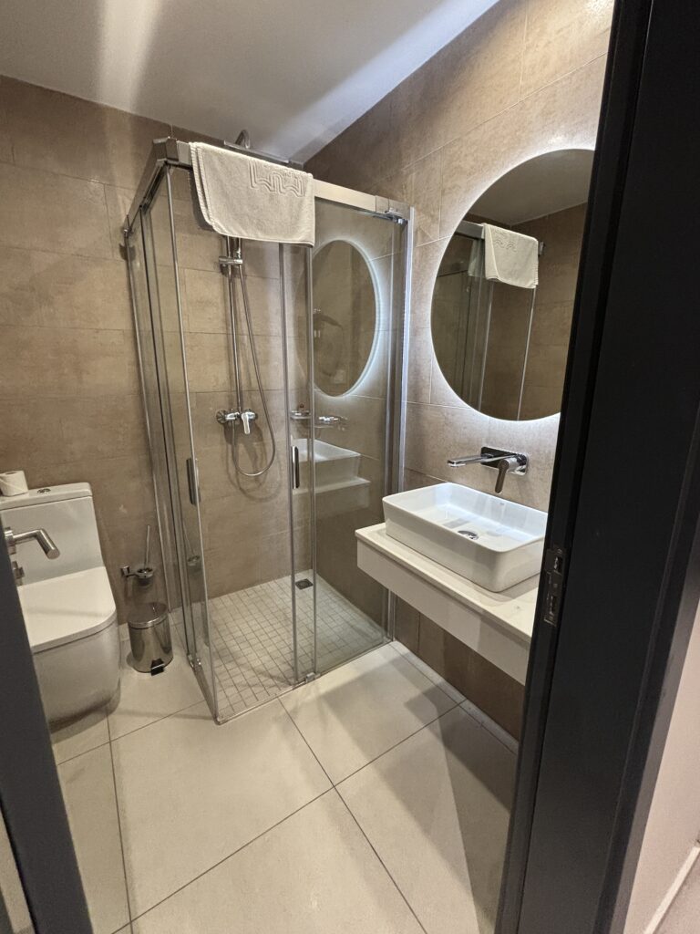 バスルームは透明のシャワーブース、隣りにトイレ、手前に洗面台と大きな鏡。