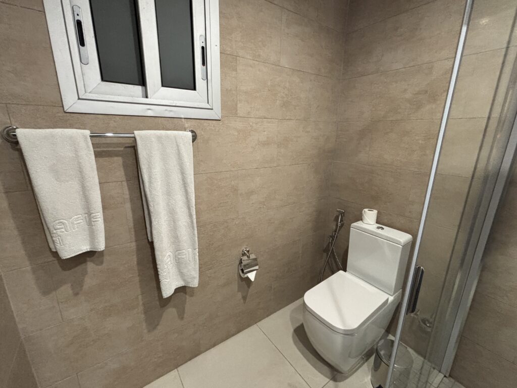 トイレは手動ウォシュレット(と私は呼んでいるシャワー付)、タオルは口コミ通り、使い古し感満載でゴワゴワでしたが、ま、アフリカでふっかふかの真っ白なタオルを期待してはいけませんよね、贅沢は望まず、エコに徹します。