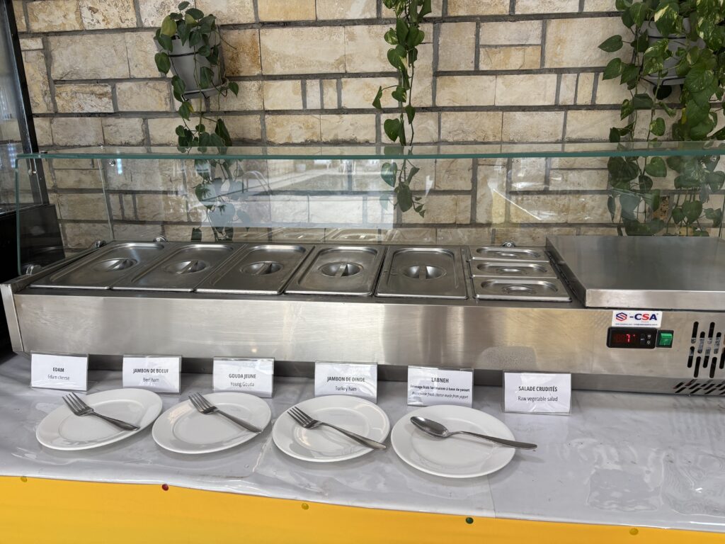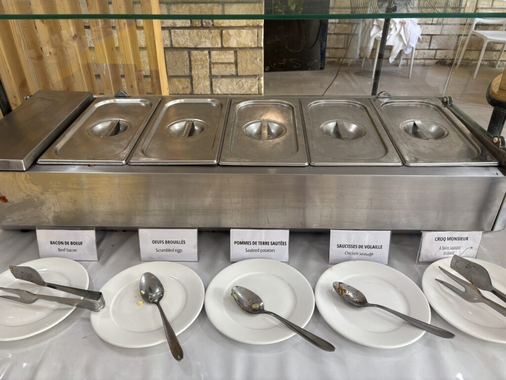 ホットミール各種。ハエや虫が多いので、蓋必須、開放厳禁です。右から、クロックムッシュ、チキンソーセージ、ポテトソテー、スクランブルエッグ、ビーフベーコン、