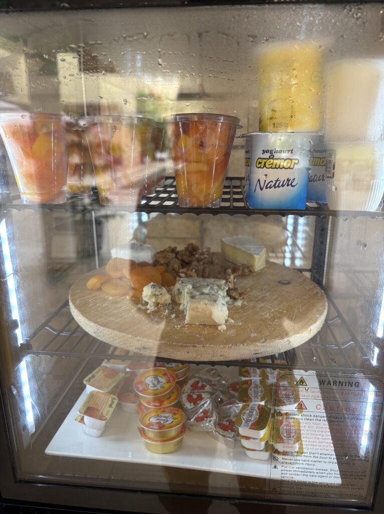 冷蔵庫の中には、カットフルーツ、ヨーグルト、チーズ各種、ドライフルーツ、ナッツ、バターやジャム
