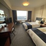 ベッドの横に、姿見、ガンガンに効くエアコン、クローゼット、ミニバー、ミニ冷蔵庫、バスルーム。