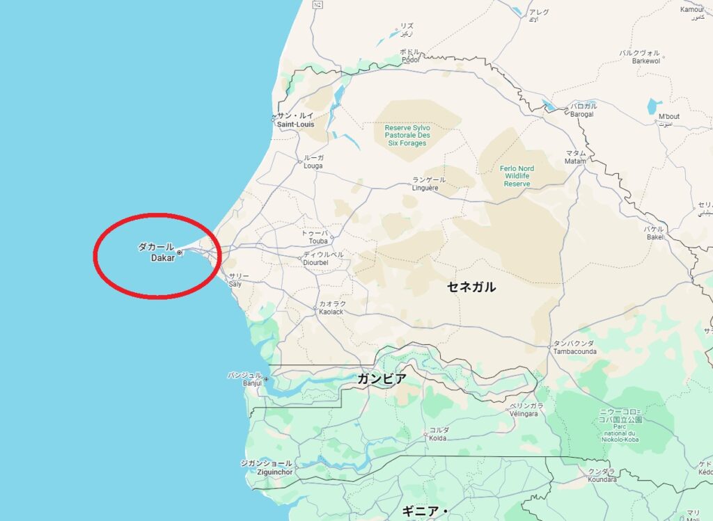 で、その首都ダカールはどこ?っていうと、西端のセネガルの中でも最西端にあります。