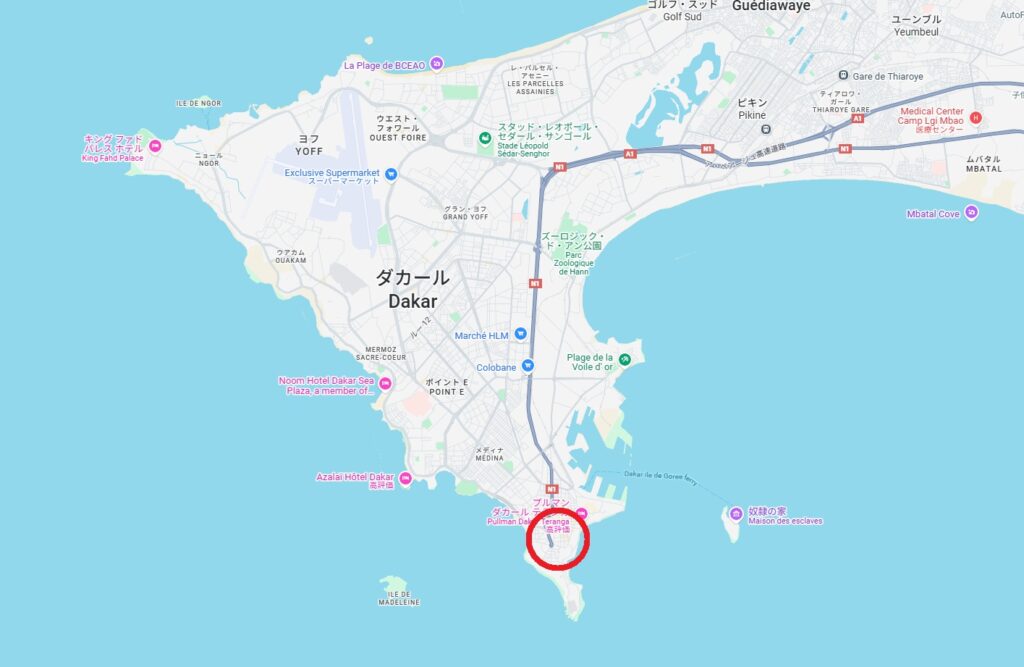 ダカール中心地に宿泊する必要があったのですが、そもそも中心がどこなのかわからず、色々調べてやっと赤丸印のあたりだという事がわかりました。