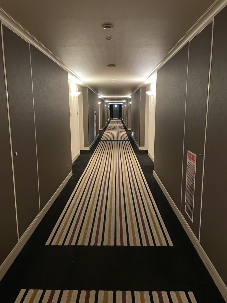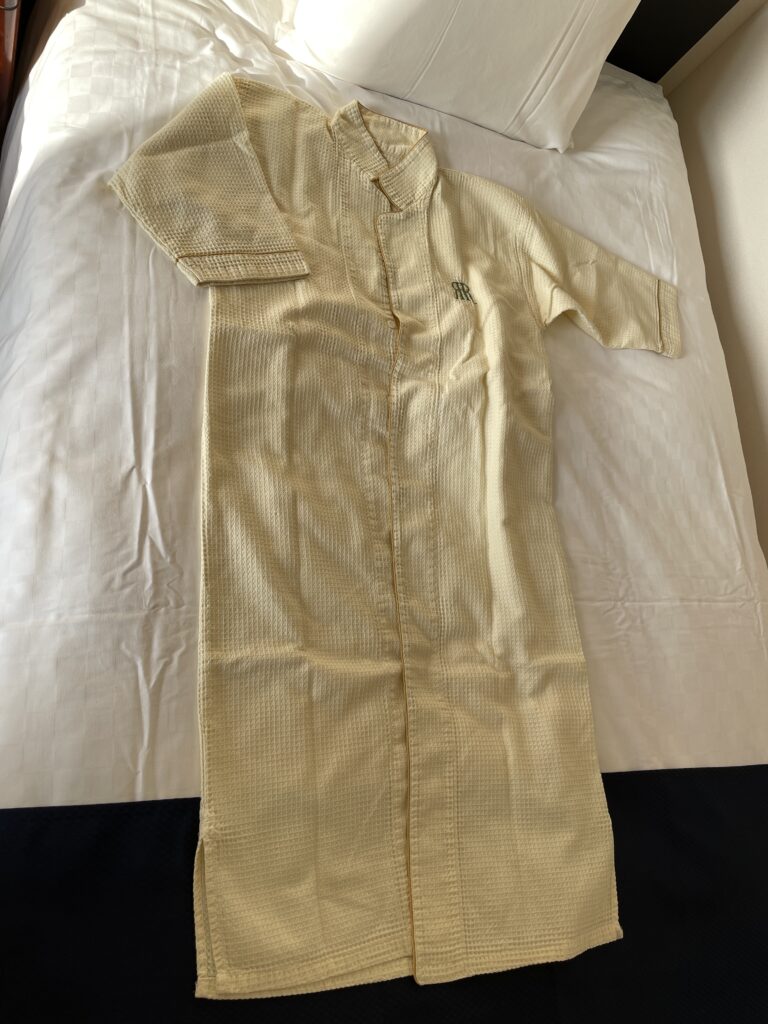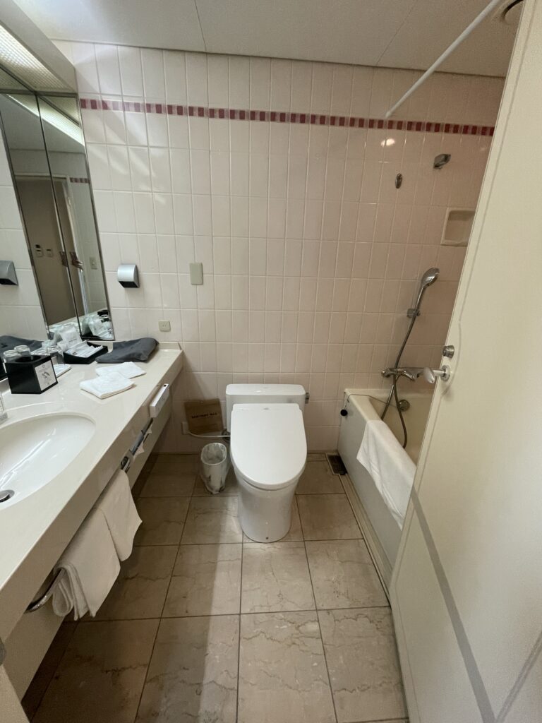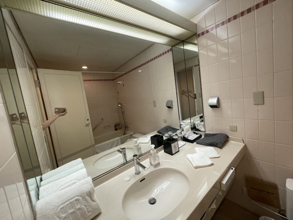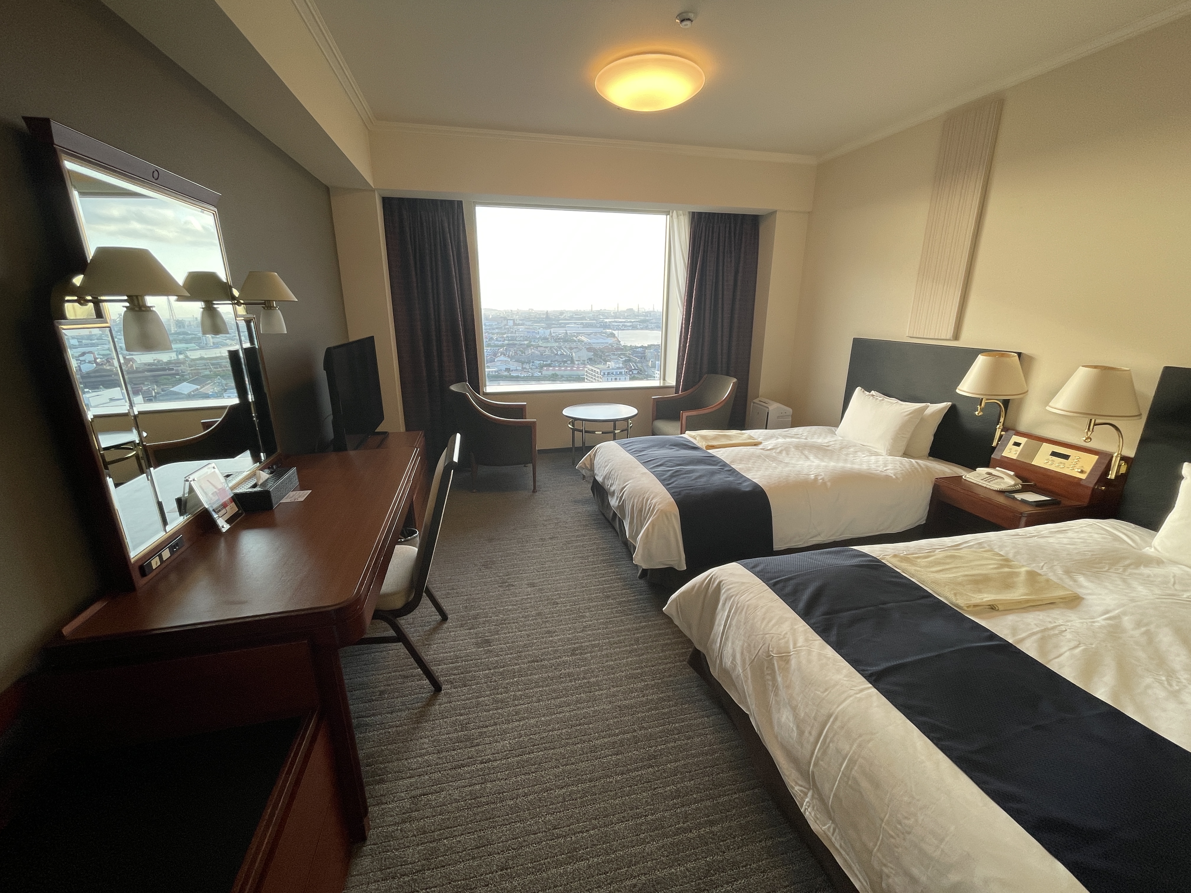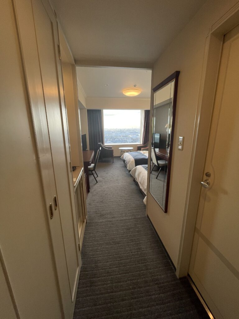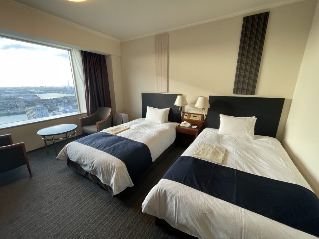 客室は、14~23階のスーペリアフロア、24~25階のスーペリアフロア、26~27階のタワーフロアになっていて、タワーフロア宿泊者には、特別朝食セット無料、ヘルスクラブスパ・サウナ利用無料、タワーライブラリー(フリードリンク)利用無料、ウエルカムスイーツ(惑星ショコラ)、ウエルカムドリンク(スパークリングワイン)、レイトチェックアウト(12時。通常11時)などの特典があります。24~25階のスーペリアフロアは「小倉織」を取り入れたお部屋、14~23階のスーペリアフロアは、2021年に全室リニューアルされた、ベッドマットレスも高級なサータ製のお部屋です。今回は最初から「小倉織」のお部屋を予約し、25階でした!