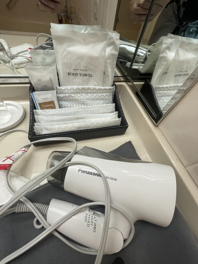 歯ブラシ、ボディタオル、基礎化粧品などのバスアメニティ。ドライヤーはパナソニック。