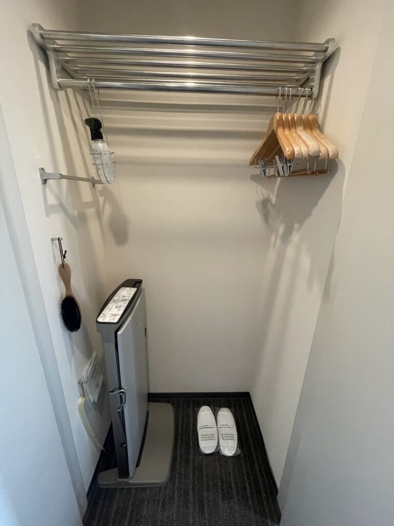 クローゼットには、ハンガー、消臭スプレー、洋服ブラシ、ズボンプレッサー、スリッパ、靴ベラ。