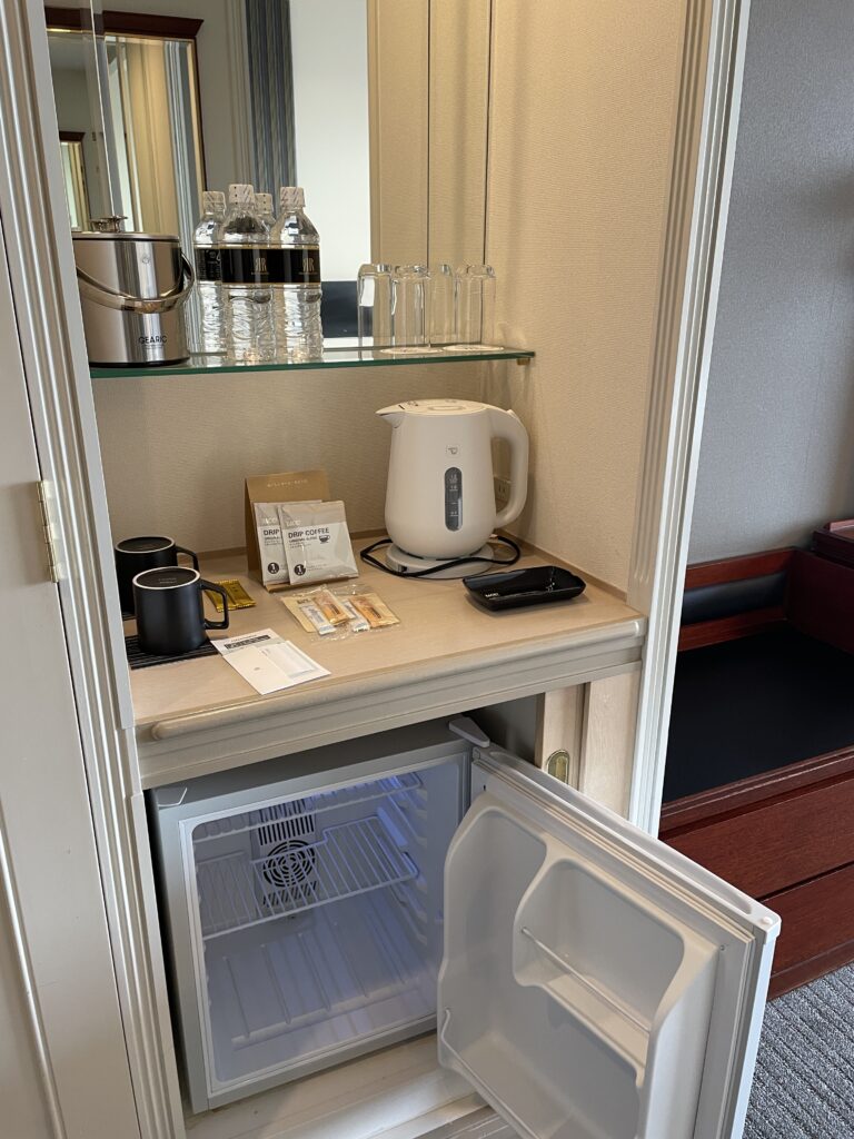 ボトルウォーター2本、アイスペール、電気ケトルは象印、ドリップコーヒー、下に空のミニ冷蔵庫。